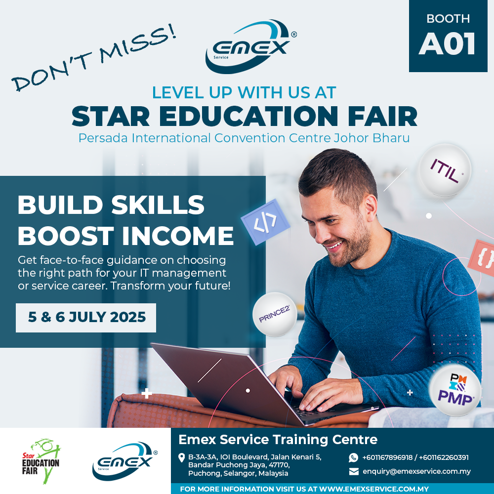 We had a great time at the Star Education Fair on July 5–6, 2025, at Persada International Convention Centre in Johor Bahru. EMEX Service Malaysia (http://emexservice.com.my) joined the event to showcase our PMI PMP and PMI ACP training programs to students, professionals, and training partners.